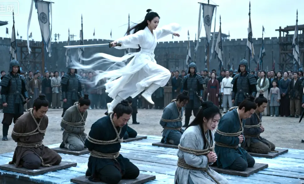 台下,黑压压跪倒一片,尽是陈家上下近百口人,男女老幼,皆被粗绳五花大绑,背插亡命牌。绳索深深陷入他们的衣衫,勒出痛苦的弧度。许多人已面无人色,低声啜泣,绝望的气息笼罩着整个刑场。