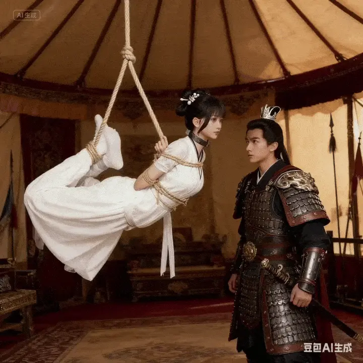却说萧云衣为了让曹休将青鸾剑留在她身边,不惜主动要求曹休将自己以极其羞耻的“四马攒蹄”姿势吊绑在营帐中。那粗糙的牛皮绳深深陷入她手腕与脚踝的嫩肉中,将全身重量都压在反绑的四肢上,迫使她身体弯成一张弓,胸脯挤压着冰冷的地面,臀瓣高高翘起,在昏暗的油灯下勾勒出惊心动魄的曲线。