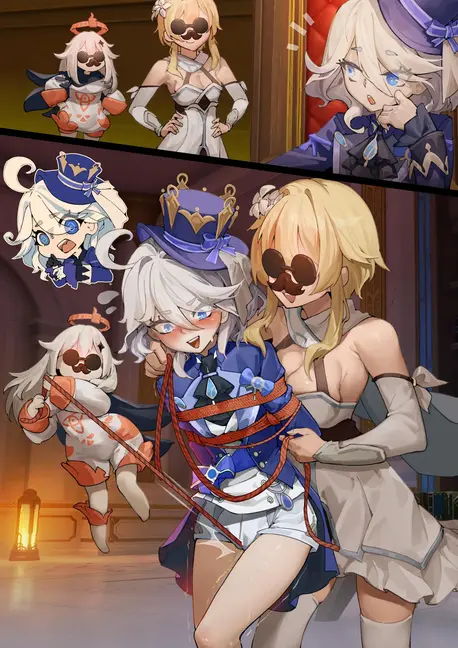 四人被推入的房间弥漫着陈旧油漆的黏腻气息,木质地板上散落着褪色的地毯碎片。墙角生锈的水管滴答作响,水渍沿着墙皮蜿蜒,像攀爬的蛇影。张诗的校服蝴蝶结沾着干涸的血渍,她被堵住的唇微微颤抖,头顶的暖光灯在她额前投下网状光斑。李文娟的发髻散乱,金属发夹卡在脖颈后的发髻,喘息声像被扼住喉咙的雏鸟。OL姐姐的高跟鞋在地板上划出刺耳声响,她试图咬开胶带......