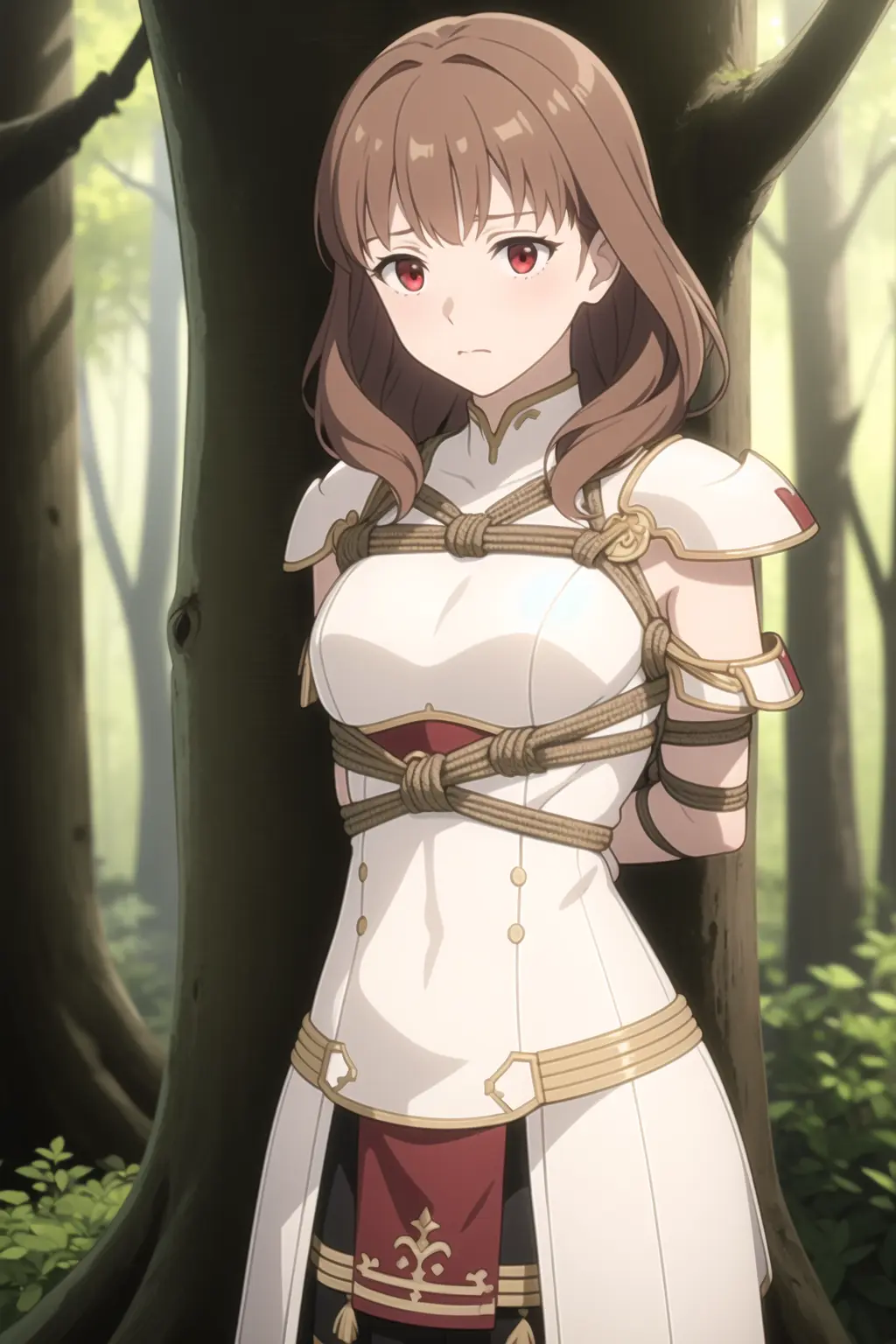 少年骑士在森林中遭遇敌方的女士兵,将她抓 住后用绳子捆绑押走的故事。