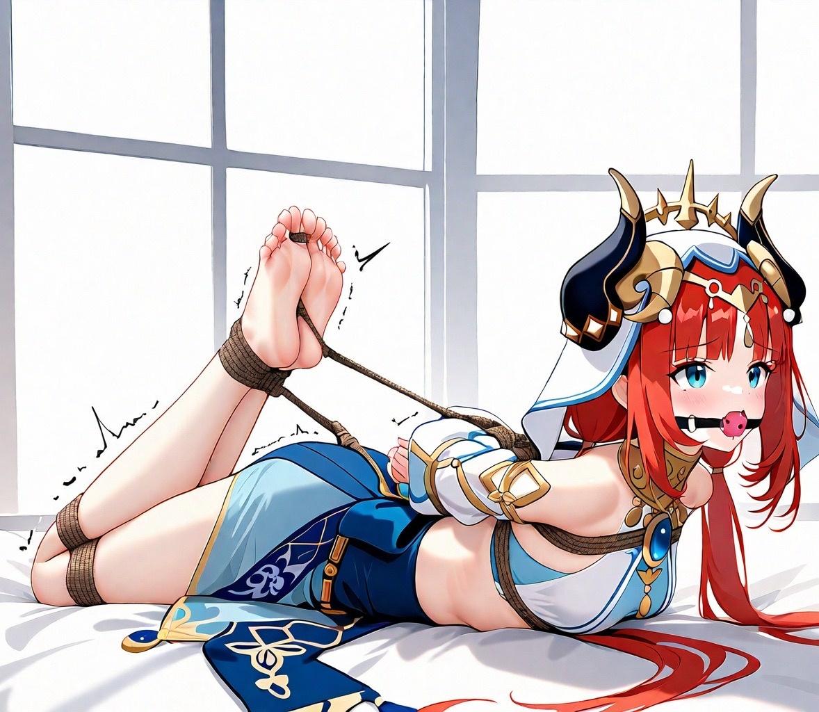 绮罗被束缚成一种极度屈辱却又充满奇异美感的姿态:双臂反剪在背后,手腕被绳索勒得发白;纤细的腰肢被暗金丝带勒出完美的弧度,与丰润的臀瓣形成惊心动魄的对比;双腿并拢紧缚,从脚踝到膝盖被绳索缠绕得如同包裹精美的礼物。