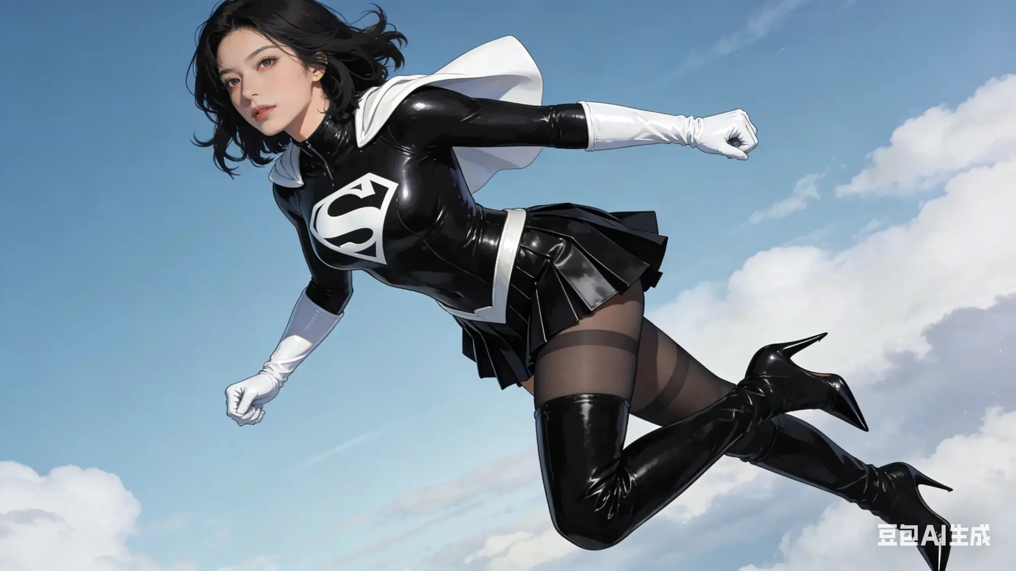 灯光自动亮起,柔和的白色光线照亮了整个空间。装备室的设计简洁而高效,正中央是一个人体模型,上面展示着她的全套战衣——黑色乳胶超人紧身衣,胸前有白色的“S”字母,旁边依次陈列着白色乳胶过肘长手套、黑色乳胶超短百褶裙、白色不过肩小披风、白色V形腰带、黑丝连裤袜,以及那双标志性的黑色乳胶过膝尖头高跟长靴。