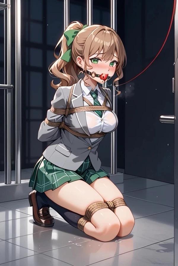 袋子里的东西是一个身材娇小的女孩。现在的女孩穿着一身JK服装,白色长筒袜,看起来像是某个学校的制服。她的双手被反绑在背后,上半身大白兔上下都缠绕着严密的绳索,......