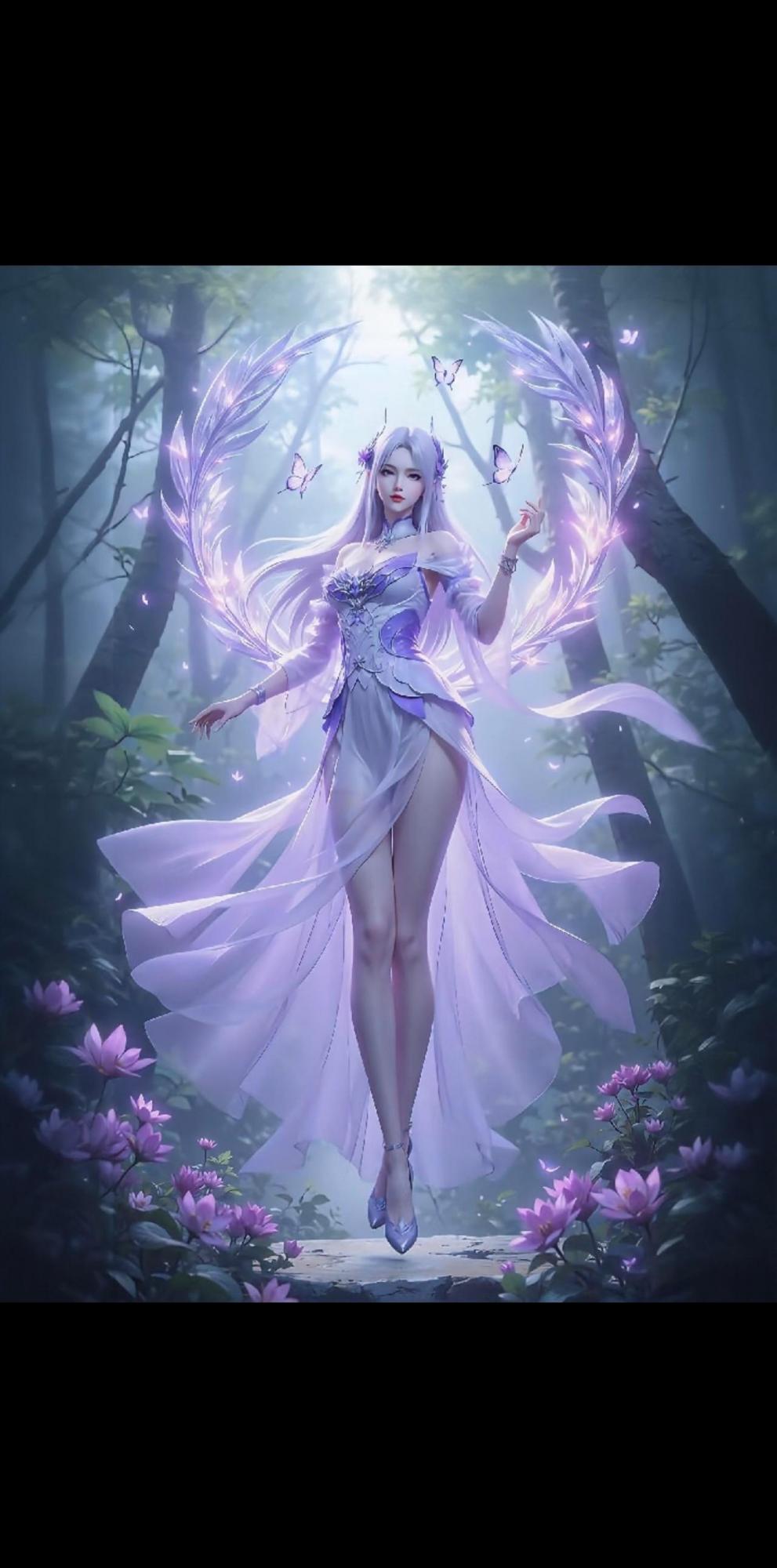 那种美,一种糅合了山野灵气与星辰幽邃的美。肌肤似终年不化的雪山初雪,清透之下隐约流动着温润的光泽;一双眸子澄澈如秋日深潭,倒映着林间碎光与翩跹蝶影,眼波流转间,温柔深处藏着几许亘古的、令人心尖微颤的神秘。淡紫色的长发似有林风眷恋缠绕,发梢与发间点缀的细碎晶花一同轻曳。