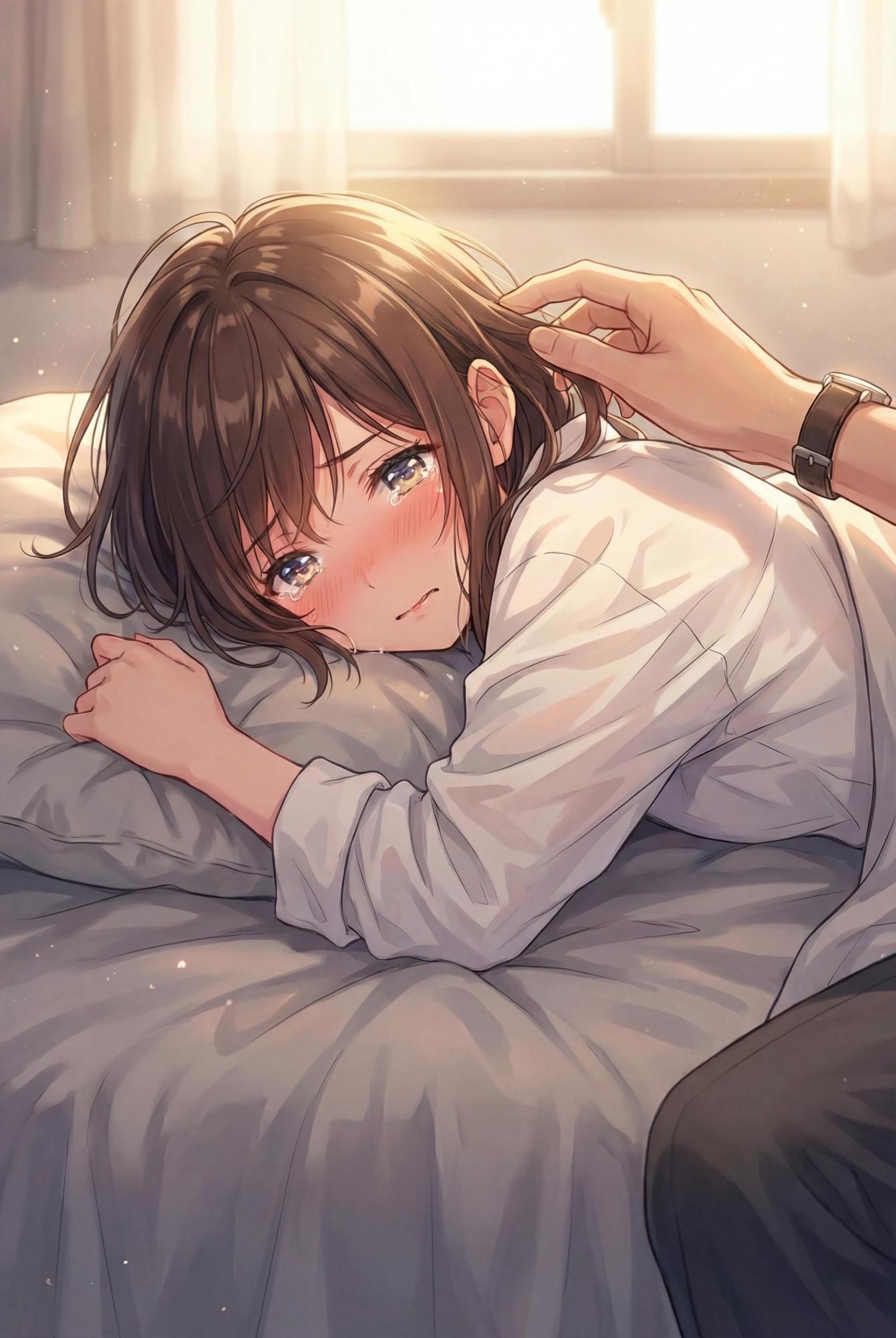 卧室昏黄的暖光下,她伫立在那里。从背后望去,她宛如一幅精心构图的诱惑油画。那一头浓密柔软的红棕色长发如瀑布般倾泻而下,发梢几近腰际,发丝间带着些许凌乱,透着刚刚被手指肆意拨弄过的慵懒与撩人气息。她身着一件纯白短裙,裙摆轻薄如翼,边缘缀着两条细细的深蓝缎带,本该是像少女制服般清纯的装束,此刻却因她那刻意的姿势而彻底染上了情欲的味道。
