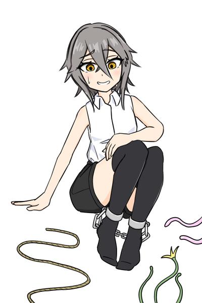 白色无袖衬衫配黑色短裤,穿着黑色过膝袜与运动鞋。