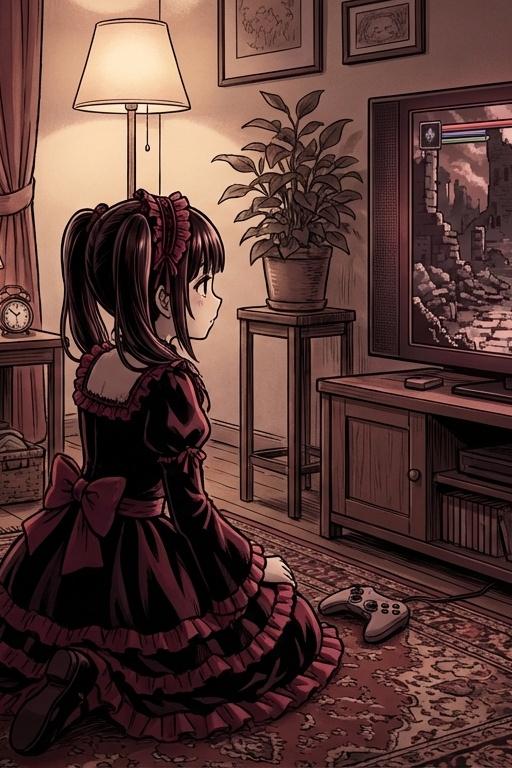 她今天特意穿上了那套最心爱的洛丽塔连衣裙——深酒红色的天鹅绒主体,黑色蕾丝的层层褶皱从腰线倾泻而下,领口处缀着手工缝制的玫瑰暗纹。白色连裤袜紧紧包裹着纤细双腿,袜尖的蕾丝花边在脚踝处若隐若现。这是她第一次穿着如此正式的装扮打游戏,仿佛即将奔赴的不是虚拟的亚楠城,而是一场真实的宫廷舞会。