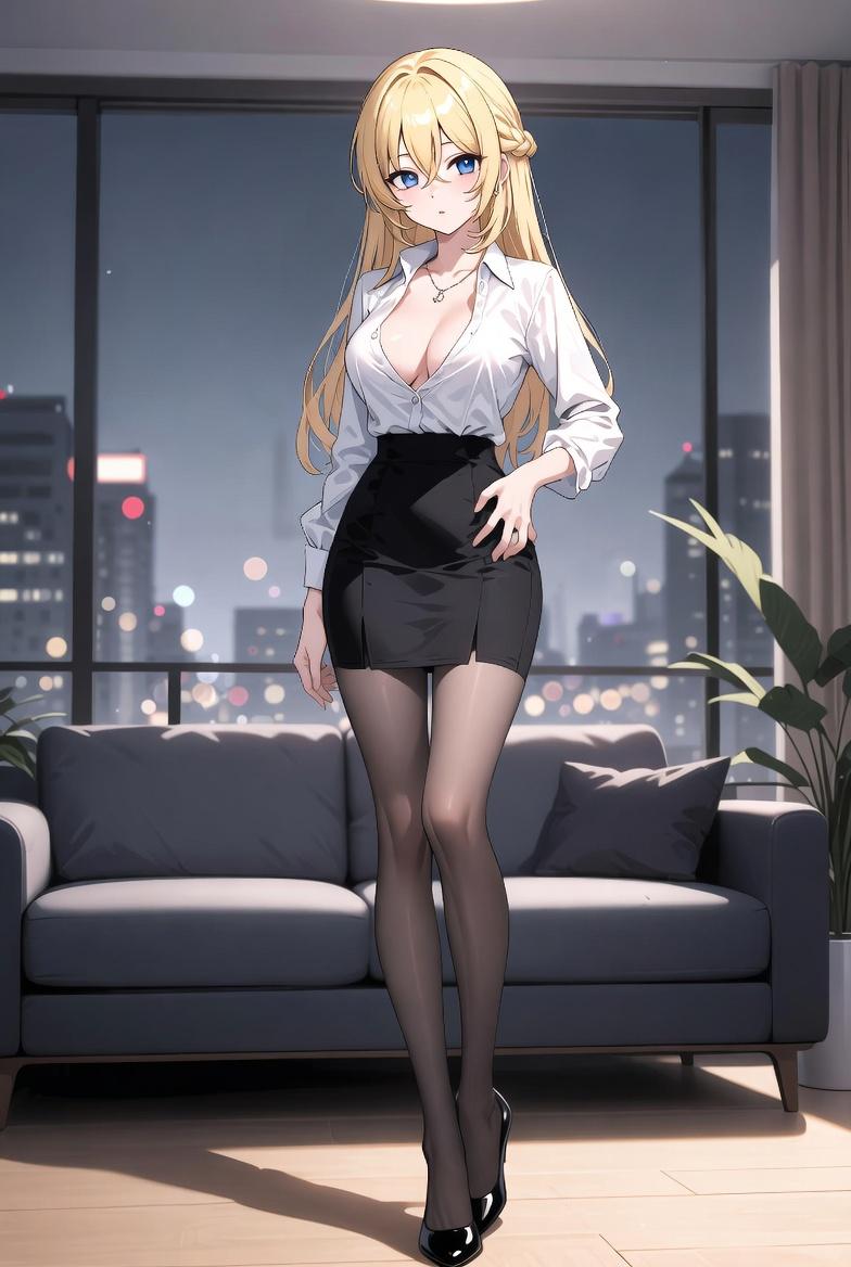 林鹭,32岁,某外资银行私人银行部高级经理。身高172cm,体重51kg,肩窄腰细,腿长得惊人。她刚下班回家,脱掉了深灰色西装外套,只剩白色丝质衬衫(最上面两颗扣子解开,露出精致的锁骨链)和黑色铅笔裙。腿上是她惯穿的15D超薄黑色连裤丝袜,脚上还踩着7cm细高跟,鞋跟敲在木地板上的声音清脆而疲惫。