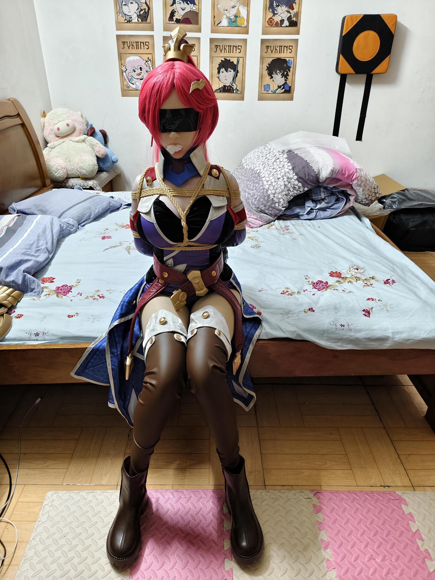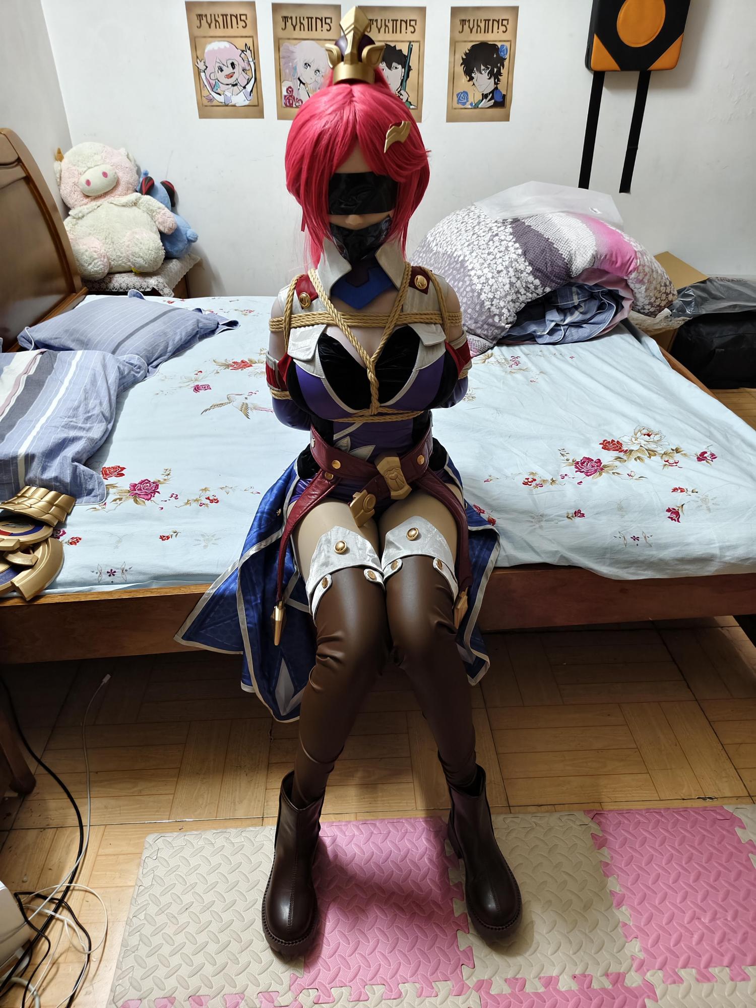 两条长腿被强行并拢,从大腿根部开始缠绕粗绳,一圈圈向上,直到膝盖上方才停下,然后再从脚踝开始另一组捆绑,把她的过膝棕色长靴也绑得死死的。靴筒被绳索勒出凹痕,靴底紧贴在一起,连脚趾都无法分开。她试图用力蹬地,却只让椅腿发出轻微的吱嘎声,股绳立刻回馈般地收紧,让她痛得全身一颤,只能发出压抑的「呜……呜呜……」声。