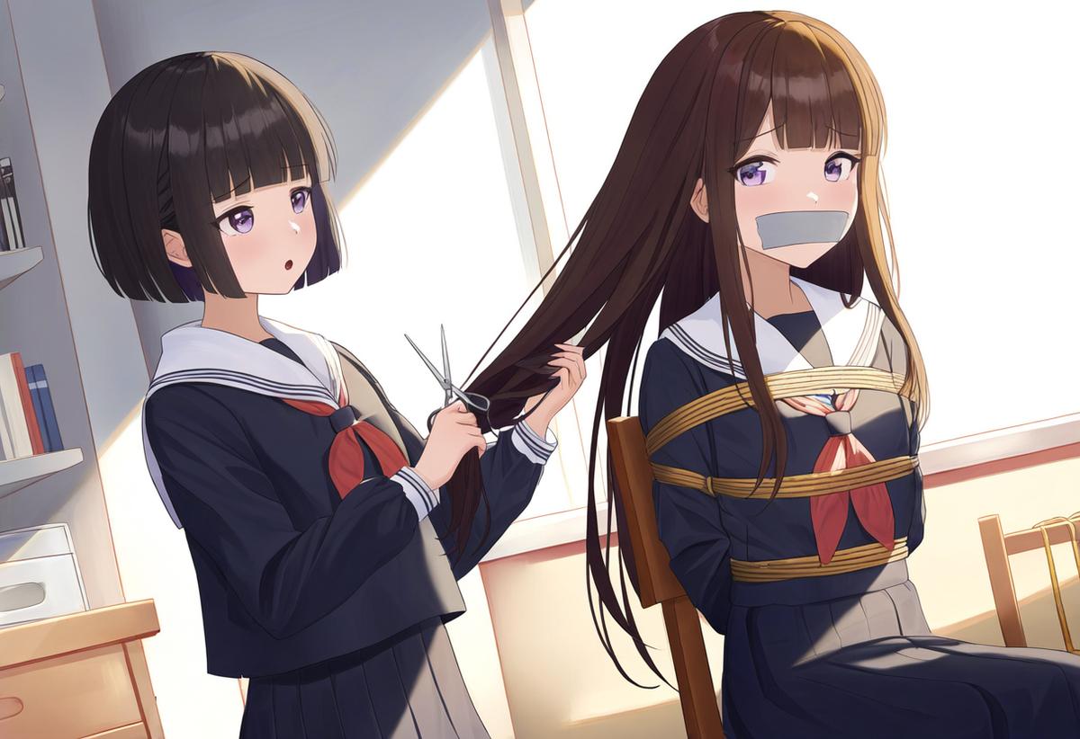 凛愣了一下没有动,深月走过去按住她的肩膀往下压,凛比她高一点但力气没有她大,被按得跌坐在椅子上,栗色的长发散开铺在椅背后面。