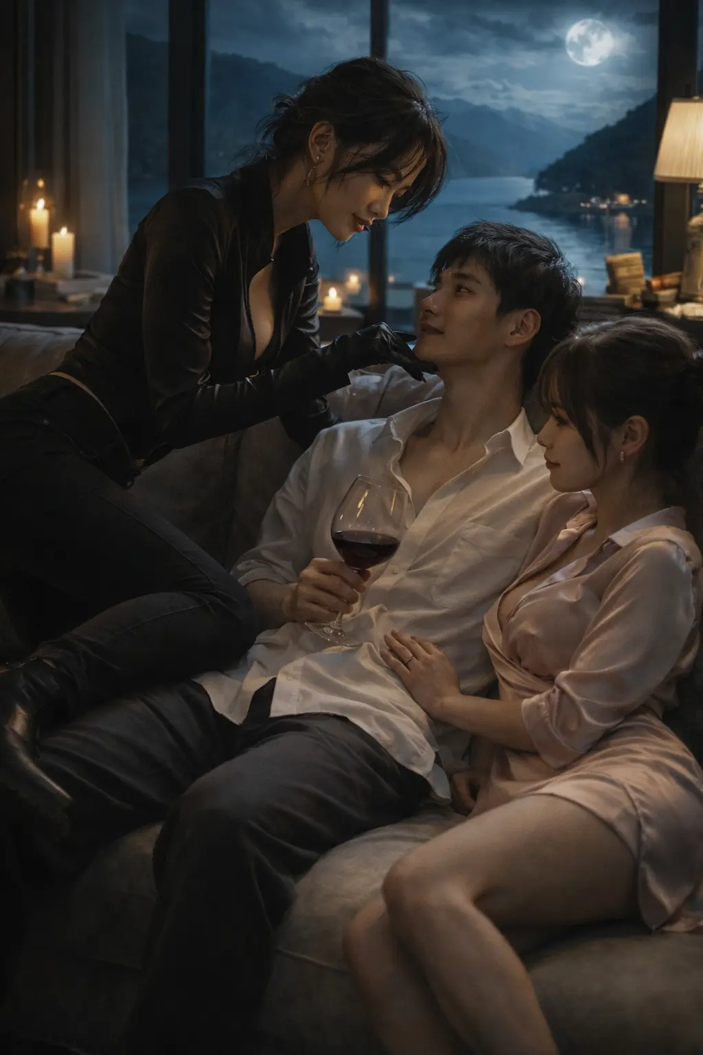 月光像一层薄薄的银纱,铺在湖面上,也铺进落地窗后的客厅。锁先生正坐在沙发上,穿着宽松的白色衬衫和家居长裤,手里拿着一杯红酒,姿态闲适得像一位真正的文弱书生。