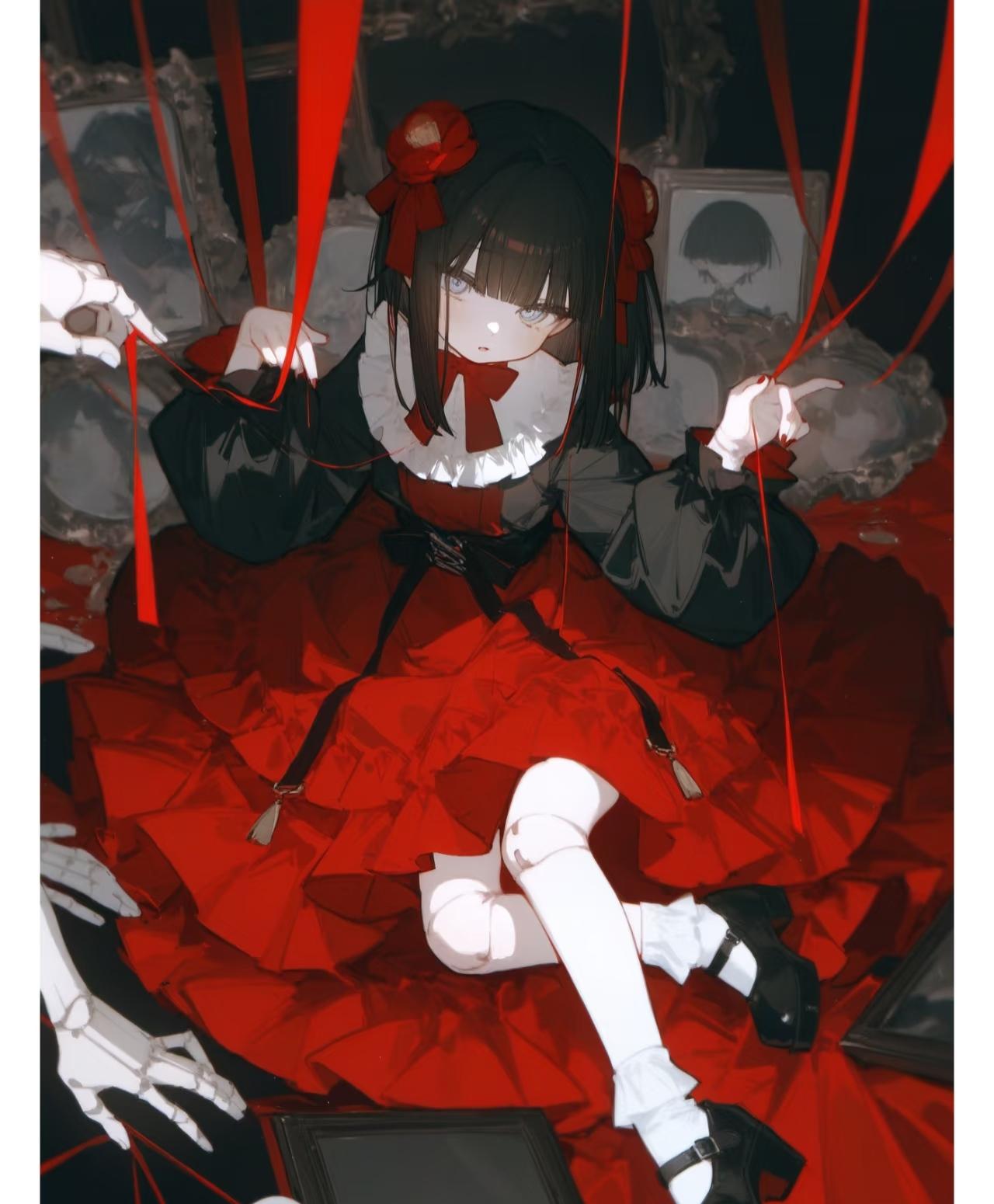 白色长发披散在肩头,与红白相间的女仆装形成鲜明对比。苍白的肤色在红色的衬托下更加明显,灰蓝色的眼睛在灯光下显得大而无神。镜中的少女看起来精致、脆弱,就像……就像真的一个人偶。