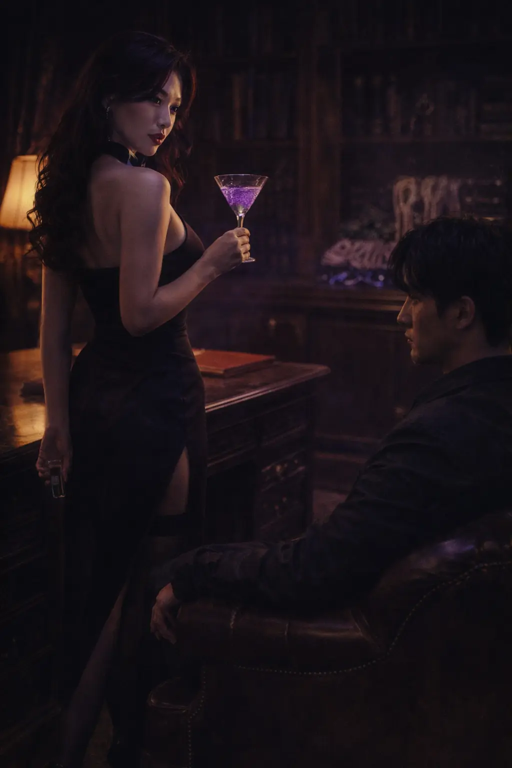 锁先生府邸的书房里,灯光调得极低,只剩下一盏落地灯投下暖黄却冰冷的光圈。空气中弥漫着陈年雪茄与老橡木的味道,书架上层层叠叠的古籍与当代艺术品无声地昭示着主人的双重身份——表面上是低调的艺术收藏家,暗地里却是黑白两道都忌惮三分的危险人物。