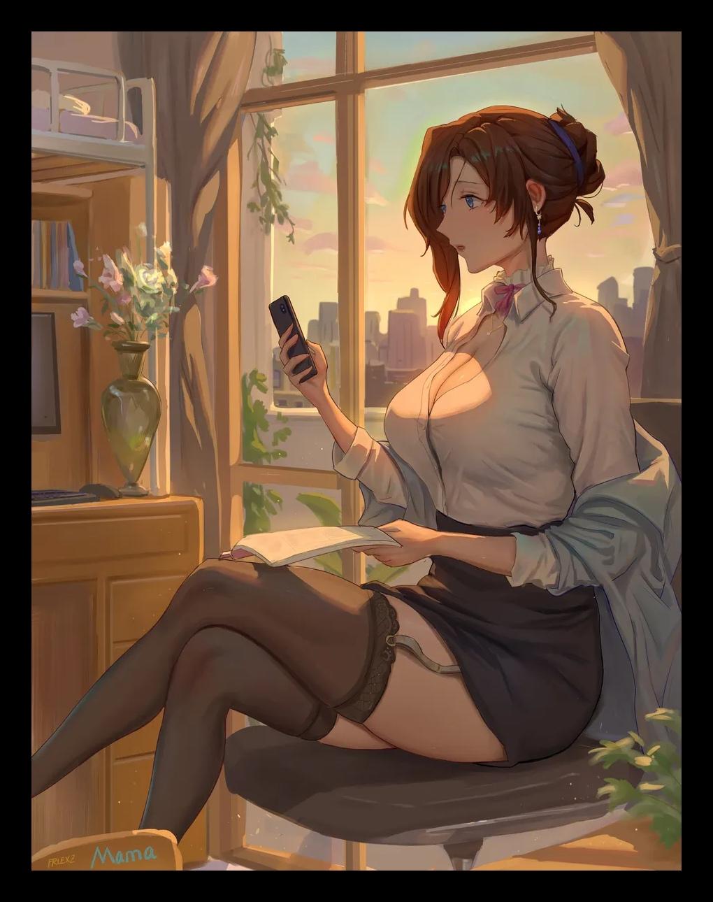 她今天穿了一身看似得体的米白色针织衫和及膝裙,但若仔细看,便能发现裙摆下隐约透出包裹着腿部曲线的黑色丝袜光泽,脚上是一双低跟皮鞋。