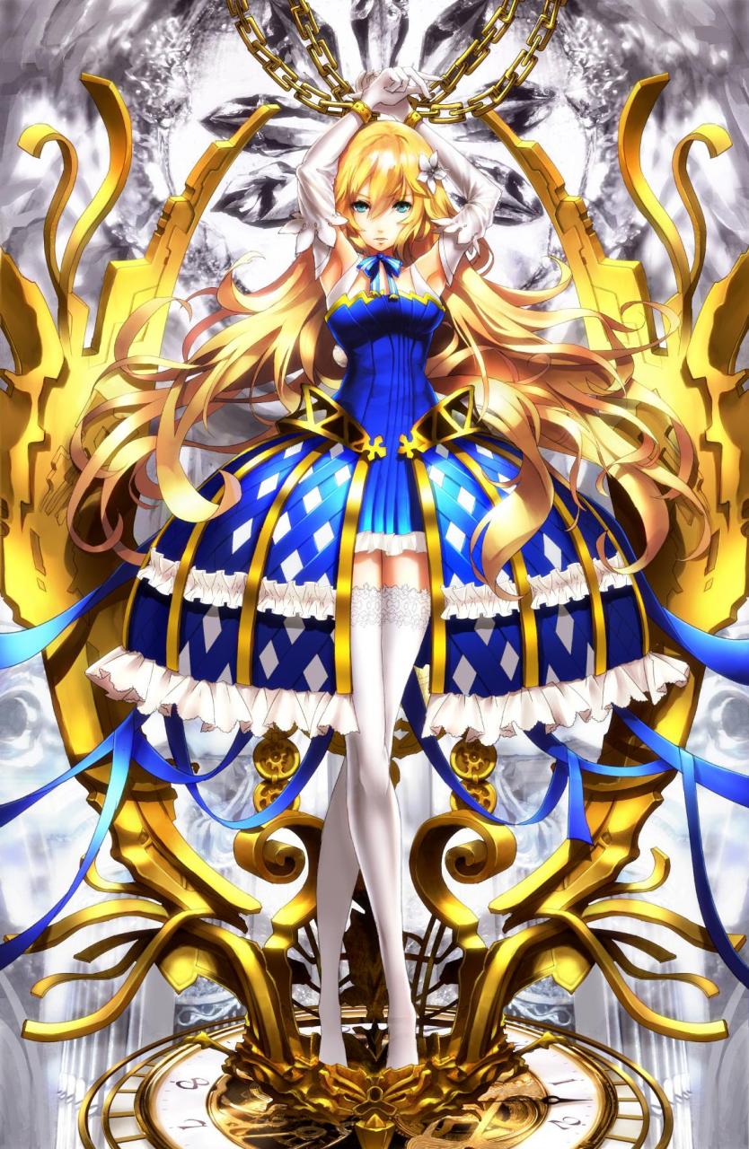 公主有着一头金发和碧蓝色的眼睛,双手被金色手铐锁住,被锁链高高地吊起在雀笼的顶部,只能脚尖着地。