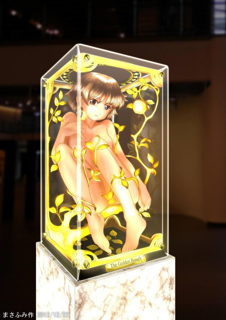 公主右左前方是一个大理石底座的水晶箱子,里面遍布着金色的枝叶,将一名蜷缩的少女包裹着。