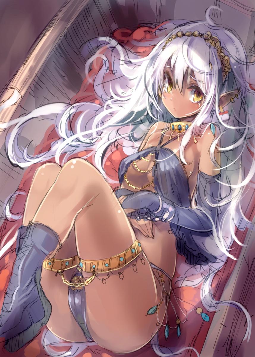 身上佩戴着镶嵌了绿色宝石的金色饰品,包括发卡,耳环,项圈,用细链连在一起的大腿环,和一副手铐。