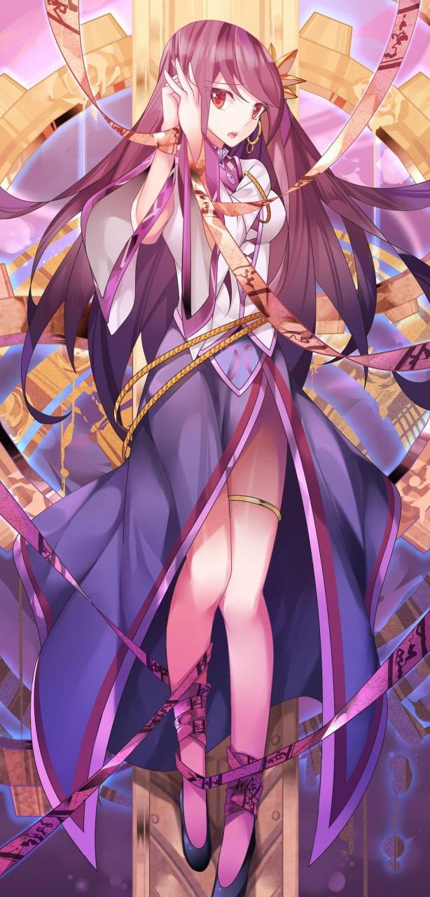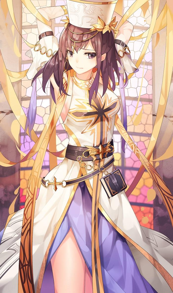 一头紫色的长发,身穿白色上衣和紫色长裙,金色的大腿环将双腿收拢。