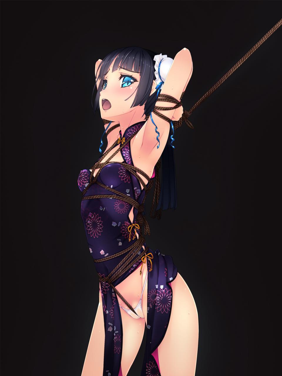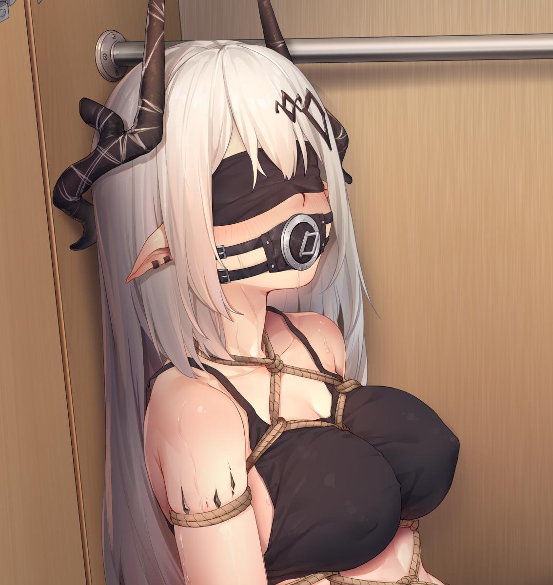 她被绳索密集的捆绑成后头两手缚的姿势,双臂被向后压在后脑的两团包子的后面。