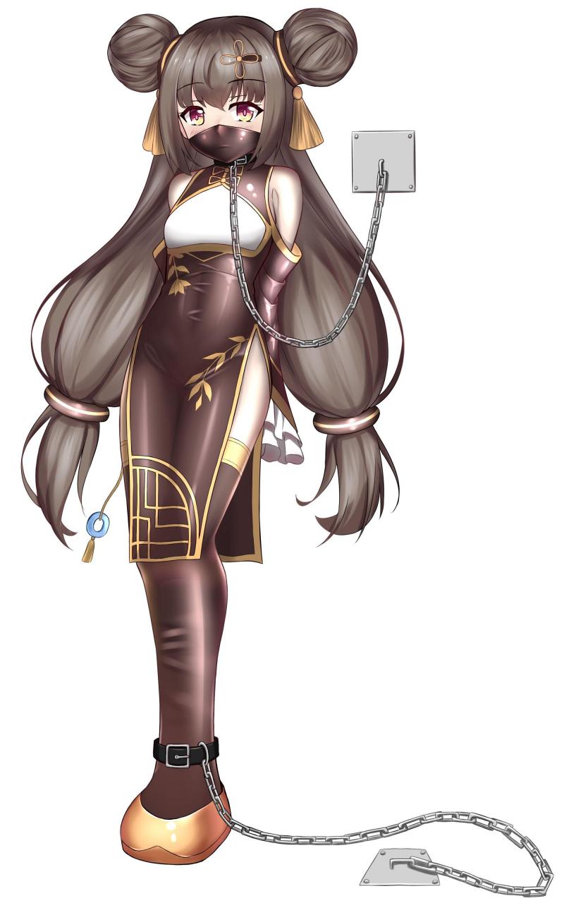 除了平时常用的手枷、脚枷、眼罩、口枷等拘束具,她的铁制的手枷上还用铁链连接着一个巨大的长方形金属块,需要四五个壮汉帮忙抬着才能缓慢前进。