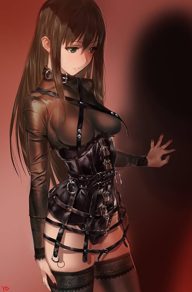 纵横交错的皮带缠绕着上半身,两条交叉的皮带刚好遮住乳_头,腰间追加的两条皮带勒紧腰肢的同时加固了拘束衣。