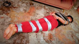 After a while, Alba comes back, Joel thinks he learns his lesson but his flatmate doesn't think so. Joel is not tape hogtie, with a different gag, Alba comes and exposes his sexy butt just to humiliate him a little more, she spanks him, and she goes away again leaving Joel alone. Joel is getting more and more tired, but Alba has a last idea for teaching Joel how to be a good flatmate. She adds a tape wrap gag and she connects the gag with the feet, to make the bondage even harder..