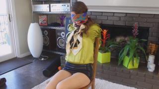 Elegant woman Chrissy Marie tied during home invasion, gagged and blindfolded with her expensive silk scarves!忙碌了一天后,一家重要公司的首席执行官克莉丝·玛丽回到了她豪华的公寓,但她发现了一名入侵者。在她报警之前,她被一名男子抓住,并用绳子将她绑在椅子上。克莉丝·玛丽要求他释放她,但她不断被人用手堵住嘴。坏人决定她必须保持安静,但他没有胶带或其他东西可以堵住她的嘴,所以他拿出克莉丝的昂贵丝巾,用其中一条紧紧地堵住了她的嘴。丝巾的堵嘴效果非常好,克莉丝无法尖叫求救,她被绑得很紧。坏人还用另一条丝巾蒙住了她的眼睛。丝巾与她穿的丝巾和闪亮的缎子衬衫很相配。最后,坏人用另一条丝巾完全遮住了克莉丝的脸,让她被绑住,无助!After a long day, Chrissy Marie, the CEO of an important company, is back to her fancy apartment but she finds an intruder. Before she can call the cops, she get captured by the man who ties her up to a chair with ropes. Chrissy Marie demands him to release her but she gets constantly handgagged. The bad guy decides she must stay quiet but he didn't have any tape or anything to gag her, so the dude takes the expensive silk scarves that Chrissy has, and use one of them to tightly gag her. The silk scarf results a very effective gag, Chrissy can't scream for help, and she is tied very tight. The bad guy also uses another silk scarf to blindfold her. The silky scarves matches with the one she is wearing and her shiny satin blouse. at the end the bad guy uses another sarf to completely cover Chrissy's face and leaves her tied and helpless!