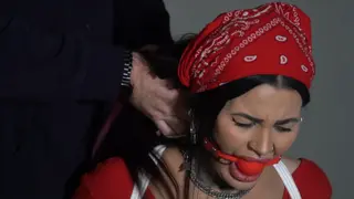 Liv is wearing a bandana and is tied to a chair. She is not happy about it and screams and wails. But we soon gag her. Twice, first with tape and then with a ballgag.