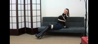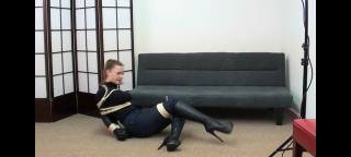 Serene is dressed in classic Tied in Heels attire...tight long sleeve turtleneck, black leather opera gloves, skin tight blue jeans and killer black leather high heeled platform knee boots! Sexy Serene gets ballgagged and tied up with rough sinsal rope! Serene's sexy attire really compliments her fantastic figure! And she looks even better struggling in tight rope!