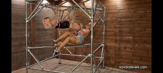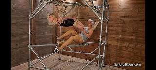 Zonah Bellum hangs suspended in the rigid steel bondage frame of M.O.N.S.T.A.R.*, her wrists, chest, thighs and ankles tightly bound in a flying hogtie modification to the structure as Sandra Silvers takes control. Clad in black lace Rago girdle, bare nylon stockinged feet wriggling abover her ass, Zonah’s arched back and parted lips betray the relentless pleasure-pain of Sandra’s Hitachi Magic Wand circling her sensitive clit with not a stitch of fabric keeping the pulsations from pleasuring Zonah's pussy.