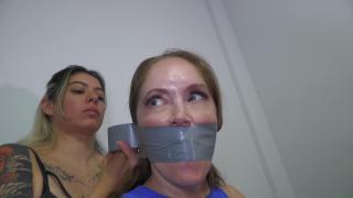 Rachel Adams and Liricaa live together. They are having a lot of problems to pay rent, they really need money as soon as possible. Liricaa has an idea, they can simulate a robbery and make the insurance company pay them. She proposes to tie up Rachel to make it more credible. But Rachel doesn’t like the idea of being tied up! But they are out of ideas and they really need to money, so Liricaa decides to make her move. She grabs her arms and ties her hands with rope. Rachel protests, but Liricaa quickly handgags her. “MMMMMMMMMPPPPPPPPPPPPHHHHHHH!!!!!!!!!”. She removes her socks and gags Rachel with the socks and a big tapegag. Then she ties her up with a lot of tape. Liricaa leaves to prepare the house to seem like there’s been a robbery. Rachel is left to struggle. She tries to escape but is impossible! Liricaa returns and fins Rachel struggling there. She really needs Rachel to remain still so she doesn’t mess up the plan. Liricaa decides to hogtape her. Rachel can’t move anywhere now! Liricaa leaves, and Rachel is left there struggling. “MMMMMMMMMPPPPPPPPPHHHHHHHH!!!!!!!!!!!”.