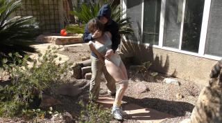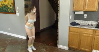 Mia has been left tied up & gagged on her bed in just her bra, panties, ankle socks & sneakers. Unable to loosen her bonds, she decides to make an escape. She slides off the bed, rolls her bound body across the floor to the bedroom door where she manages to stand up and hop her way out. She hops all the way to the front door but when she opens it, she sees the thug that tied her up standing outside. She hops her way back down the hall to the back door – but it is locked!