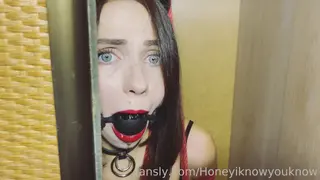 Confined in a closet, this sexy brunette is waiting for her master. Bondage rope, stockings, blue eyes, moaning,smiling,drooling, legs'up tied,reverse bondage, confined,closet