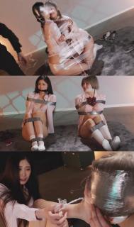 偷窥狂风格的室内捆绑场景。月形春日和小松杏身着校服出场,起初她们坐在地上,身上缠着胶带,嘴巴也被封住。一名身份不明的男子指挥着她们的动作,先是将杏的头埋进春日的屁股里,并用胶带固定,而春日则被堵住嘴巴,被束缚着。随后,她们的角色转换,春日跪在地上,头埋在杏被内裤包住的裆部,头也被胶带固定住。她们的手脚也被捆绑,行动受限。最后,两人面对面跪下,头被胶带缠在一起,身体被保鲜膜紧紧包裹,如同被封死的娃娃。镜头聚焦于她们被紧紧捆绑、行动受限以及亲密的身体接触。她们的表情交织着不适、柔和的抵抗和接受。主动恋物癖:胶带捆绑、保鲜膜、校服、近距离身体束缚、堵嘴、脸部接触、脚部定位、头部包裹、屈服、支配“Alone in her bedroom, An used to tie her dolls together - little did she know one day she’d be my doll to wrap.”