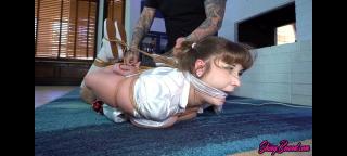 He hauls Dolly into the living room, where she's wrestled to the floor, her bound arms folded behind her. Her satin panties leave little to the imagination as a stranger's fingers roughly probe between her thighs, making her gasp. Before she can process what's happening, a satin scarf is wrapped around her face, stretching her mouth open obscenely wide. Next a vibrator is tied to her sensitive pussy, the buzzing vibrations sending shockwaves of pleasure through her quivering form.