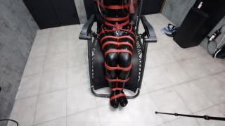 小奴被紧紧地绑了一个全身缚,放置在椅子上,先带口球,再上充气口球窒熄play,附加快乐棒强高折磨。