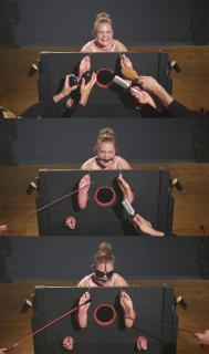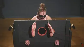 In this intense session, Vanda is fully restrained in heavy-duty stocks – both her wrists and ankles locked in place. Together with my buddy, we explore her bare soles using a mix of tickling and bastinado. For example, one of us may tickle one sole while the other delivers precise, stinging slaps to the other - and then we switch, or apply both at the same time.