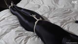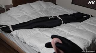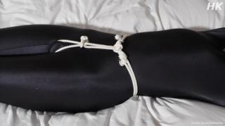 紧接着才穿一层黑色蛇纹zentai,由玩伴用绳子绑一个股绳内裤勒紧眺蛋。