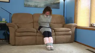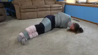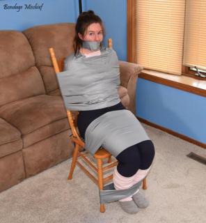 Jayme is having another slumber party with her friends. Wearing her favorite faded sweatpants, an oversized sweatshirt, and fuzzy socks, she glances around the circle of girls sprawled across leeping bags in her living room. "Remember last time when you guys tied me up?" she asks, her voice lilting with excitement. They exchange knowing looks and nod, giggling. "Could we do it again? But with more tape this time?" she adds, bouncing slightly on her heels. Her friends scramble for the silver roll of duct tape, the distinctive ripping sound filling the room as they tear off long strips. They bind her methodically—first her wrists, then working their way up her arms until the silvery cocoon reaches her shoulders. The tape makes a soft crinkling sound as it stretches across her thighs and ankles, pulling the fabric of her sweatpants taut against her skin. When they wrap the tape around her mouth and head, Jayme's eyes crinkle above the makeshift gag, her muffled laughter barely audible. She hops experimentally around the living room, teetering precariously before tumbling onto the carpet with a muted thump. "She's squirming too much," one friend declares, and together they hoist her onto a wooden dining chair. The tape makes one final satisfying tear as they circle it around her torso and the chair back, securing her in place. Jayme tests her bonds with a wiggle and finds herself completely immobilized, utterly at her friends' mercy until they decide to free her.