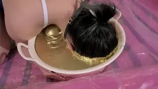 小姐姐全程佩戴了一个很大的心形口球,像一个塞子几乎堵住了嘴巴的呼吸,粘稠的金粉时不时会呛到鼻子