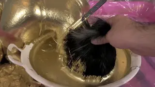 这期用的金粉液相比以前看到的要浓稠很多,像史莱姆一样糊在脸上