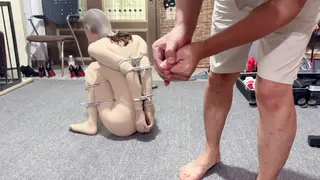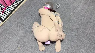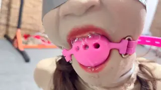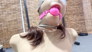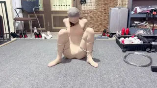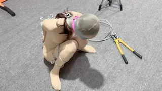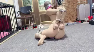 女奴穿着连体丝袜,头戴丝袜头套,被它的主人用手指粗的铁丝直臂M字腿捆绑,又用细铁丝牢牢加固,锋利的铁丝甚至划伤了手,可见女奴全身上下被其捆绑禁锢的痛苦程度;女奴被胶带蒙眼,超大口球堵住嘴吧,只能艰难呼吸着发出呜呜声;主人把玩着它柔软的凶部,又拿来铁丝做股绳,将zd棒固定在女奴的秘密花园,另一只手也不闲着,两个zd棒双管齐下,惹得女奴gc连连,口水顺着口球的孔滴满了自己的大腿;为了让它的呼吸更加受阻,主人点燃香烟,插进口球的透气孔内,女奴被呛的剧烈挣扎却又无可奈何。主人还不停手,继续拿zd棒刺激挑逗着女奴,女奴gc数次趴倒在地,撅着屁股,双腿间的zd棒来回摇晃;无奈,它太敏感了,不停在地上匍匐蠕动着挣扎,时而侧卧时而坐起,小花园早已湿透。主人就在一边饶有兴致的看着它的丑态。