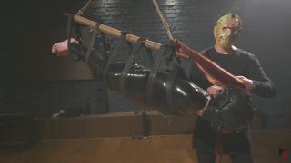 The hoist lifts her off the ground, leaving her suspended and swinging in the air, completely under control. After being rotated and displayed in midair, she is lowered onto a bondage bench, strapped down tightly. As the final touch, strips of PVC tape are added over her harness ballgag, leaving her helpless, gagged, and fully restrained. Scissors are placed nearby, but until then she can only endure and drift deeper into her mummified state.
