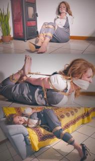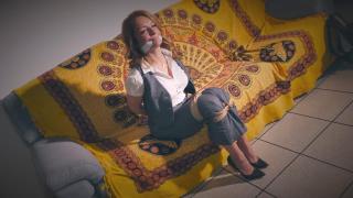 Alba meets the business partner Tony. He invites her to sit down. He informs her that her boss owes him a lot of money and that she has to stay with him until he receives the payment. Alba is surprised, wondering what this means… Immediately he produces some rope and grabs her. She protests loudly. Quickly Tony ties her hands behind her back (wrists crossed) which results in some moaning and complaining from Alba. So she soon gets cleave-gagged by Tony. Seconds later ropes circle her ankles and knees. Realizing that she can’t do much she stops the frantic struggling and focuses on finding a weakness in the ties.