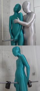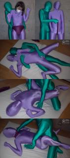 随后被银色zentai男和孔雀蓝色zentai男轮流老汉推车狠狠顶住冲撞。