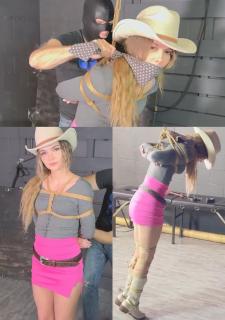 尽管处境无助,布莱克依然保持镇定和自信,随时准备迎接未来的任何挑战。Blake LaVista stood tall and proud, dressed in a traditional western attire. She sported a chocolate brown cowboy hat, tied bandana around her neck, form-fitting blouse, and a wide belt cinched tightly at her waist. Her legs were adorned with a short denim miniskirt and sturdy cowboy boots, complete with shiny spurs.