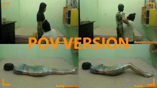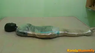A girl wearing a swimsuit is helplessly wrapped in her bedroom using cling wrap.