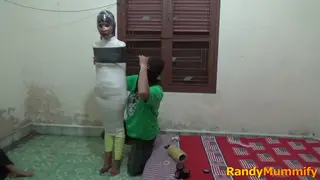 A girl is first wrapped into a mummy in a boarding house leaving her mouth to speak.
