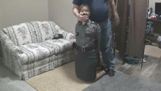 She sees a man enter his apartment and tries to get him to stop before he closes the door. She knocks and he answers, but denies any knowledge of any missing person. As he starts to close the door she remembers that she's seen him before and asks if they've had any previous dealings. He says no, but grabs her and drags her in to his place. He disarms her and hogties her on his floor using her own handcuffs and rope he had lying around. He later turns the tie into a hogtie.