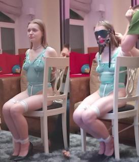 但首先,需要把女孩绑起来。Alicia 穿着漂亮的浅蓝色紧身衣,坐在椅子上,脚上穿着高跟鞋。